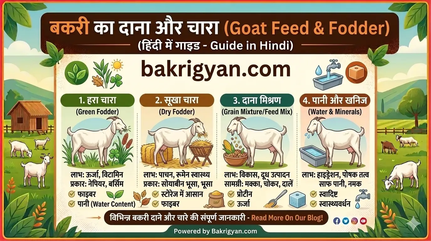 हरा चारा, सूखा चारा और संतुलित दाना मिश्रण बकरी के लिए सबसे अच्छा भोजन माना जाता है।