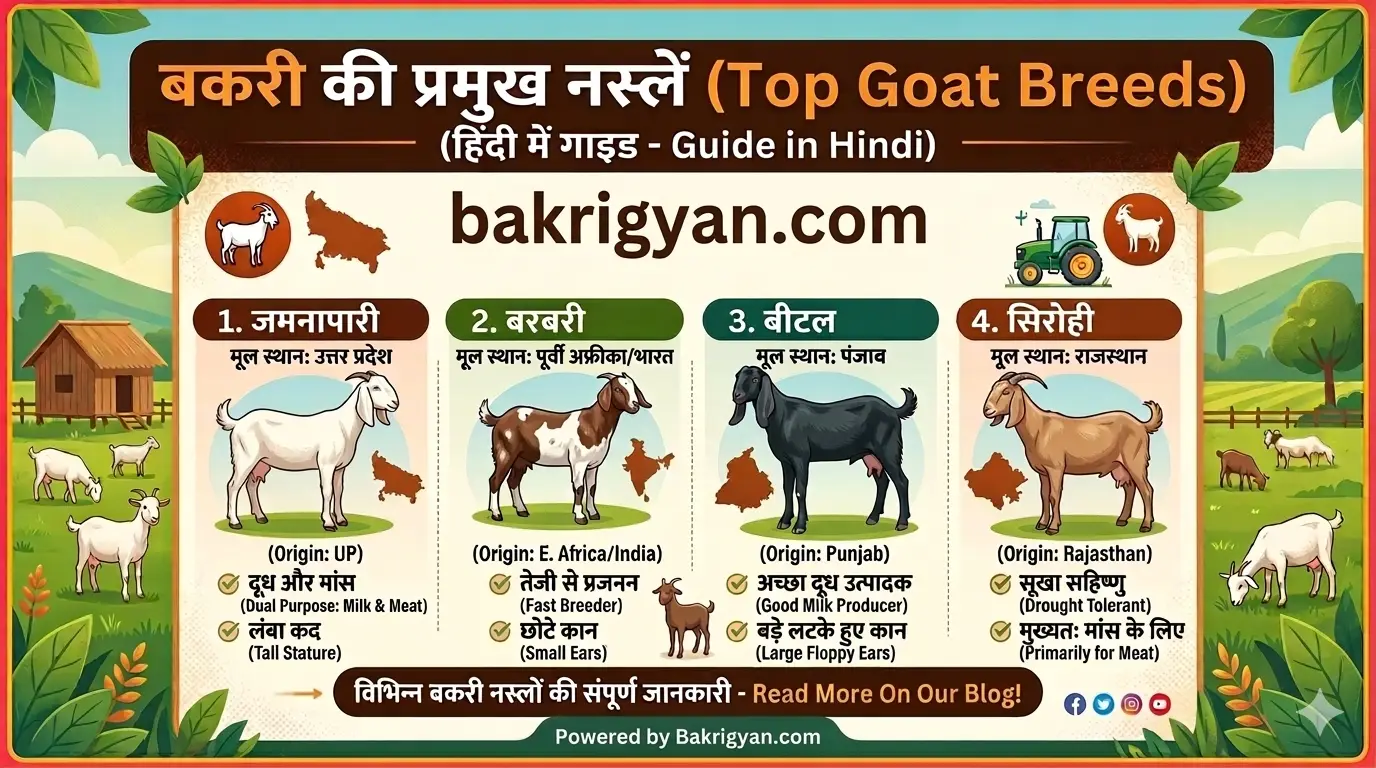 भारत में कई प्रकार की बकरी की नस्लें पाई जाती हैं। हर नस्ल की अपनी अलग विशेषता होती है। कुछ नस्लें दूध के लिए अच्छी होती हैं जबकि कुछ मांस उत्पादन के लिए जानी जाती हैं।